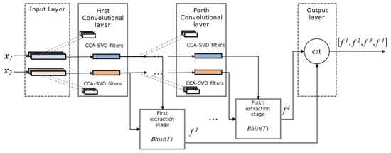 To exploit the correlation between two ECG leads, we use a one-dimensional variant of the canonical correlation analysis network (CCANet). First introduced in the field of image recognition by Yang et al. [33], CCANet has been employed in two-view image recognition tasks. Recently, CCANets, which are intrinsically two-dimensional, have been successfully employed in the signal processing field for the classification of two and three lead heartbeats [20]. A CCANet is usually composed of two cascaded convolutional layers and an output layer: (1) in the convolutional layers, the CCA technique is used to extract dual-lead filter banks; (2) in the output layer, the features extracted from the second convolutional layer are mapped into the final feature vector [20].