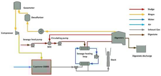 The plant is based on two anaerobic digesters with a total capacity of 4600 m3. The plant is operated for the co-digestion of municipal sewage from the wastewater treatment plant and the organic waste from the municipality collection (referred to as sludge). The nominal plant capacity is 10.8 t/h of sludge. Digesters operate at a constant temperature of 37 °C (mesophilic digestion), producing biogas with a final methane concentration of 65%. The biogas is desulfated, stored in a gasometer, and then used to power a Capstone CR600 microturbine [29], designed to work with biogas, consisting of three modules of 200 KWel each, for a total of 600 KWel.