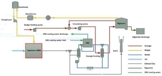 Anaerobic digestion biogas facility with the upgraded layout. The turbine exhaust gases power an organic rankine cycle (ORC) before heating the sewage.