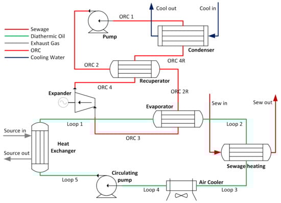 The part of the digestion plant modeled in the code includes the ORC and the thermal fluid loop (Figure 5). The design is performed by considering that all the available thermal energy is exploited under design conditions. Therefore, in this preliminary stage, the presence of the air cooler located upstream of the thermal oil circulation pump is overlooked. This heat exchanger is used to reject the excess heat to prevent sewage overheating, and its operation is considered only in off-design conditions.