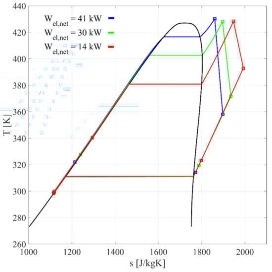 According to sliding pressure control, the ORC adapts to load changes by adjusting the evaporation pressure. The resulting superheating grade and working fluid mass flow rate were determined to maximize the cycle power output. In each operating condition, the result is an optimized cycle, like those reported in Figure 6. The ORC is considered turned off when the net power output is less than 20% of its nominal value.