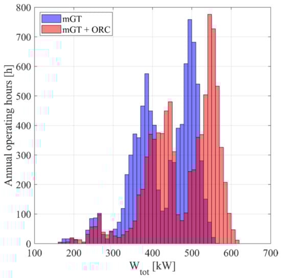 Comparison between the net power output of the mGT reference configuration and mGT + ORC configuration. Data are related to a whole year of operation. Violet shaded areas come from the overlap of the two histograms.