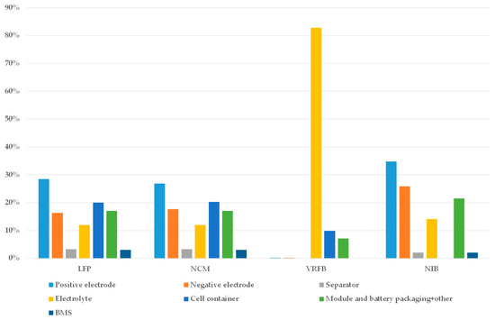 The amounts of material used in the construction of batteries depend on their energy density. In this work, the values are assumed considering lithium cells as mature, while flow batteries are more backward in development. Therefore, it is reasonable to assume a density equal to their technological limit for the former and a lower one in the relevant range for the latter. The values for NIB batteries are derived from Reference [29].