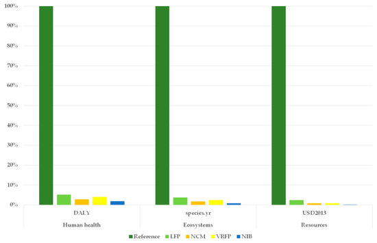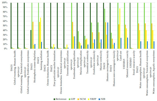 Figure 3 shows in greater detail the impact characterization since the mechanisms affecting the three areas of protection are indicated separately. In this case, it is clear that the use of LFP has the highest impact on stratospheric ozone depletion, ionizing radiation, water consumption and eutrophication, land use, and mineral resource scarcity. The impact is even higher than the use of diesel. Among the batteries, the VRFB presents the highest values for particulate emissions and terrestrial acidification. The NIB presents the lowest value for the mineral resource consumption, about 3 times lower than LFP, confirming the advantage of not using lithium, which has scarce reserves.