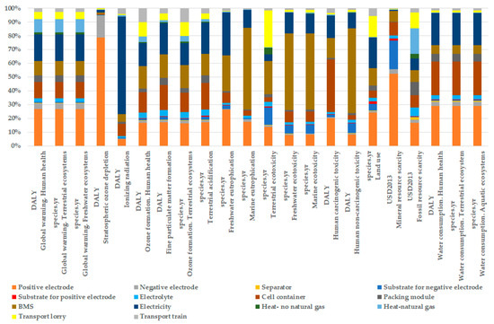 Figure 4 shows the characterization of the lone assembly phase and highlights that the main impact is attributable to the positive electrode because it uses lithium and tetrafluoroethylene. In particular, its impact is around 20% of the global impact on human health, ecosystem, and use of resources. BMS greatly affected human health (about 21%) due to the use of electronic components and the liquid crystal display. A great impact is also linked to the use of electricity during the assembly phase. Transport accounts for about 14% in the use of resources.