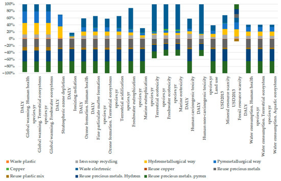 Figure 5 shows the impact of the end-of-life phase for the LFP battery. It can be noted that the reuse of metals and plastic has a positive effect on overall impact, which for some categories exceeds the impact of the waste treatment. The highest impact on health and environment is caused by the disposal of electronic waste, while for resource use the main impact is due to the pyrometallurgical and hydrometallurgical processes needed to recover lithium, cobalt, and nickel. It corresponds to about 82% of the total impact of this phase and 27% of the total impact of the battery.
