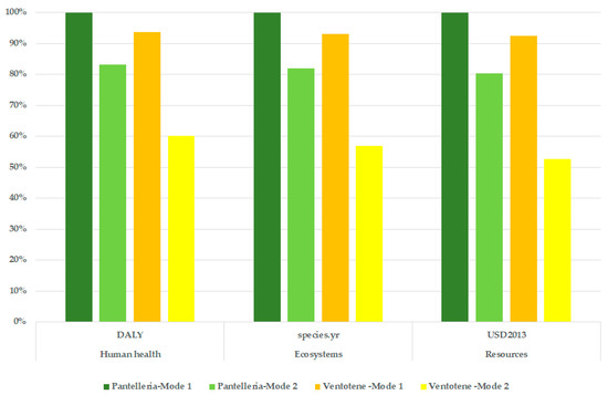 Lastly, to analyze in depth the influence on the results of the location, the damage for Pantelleria and Ventotene is compared for both definitions of the functional unit. For the sake of simplicity, only the results related to the NIB are summarized in Figure 7, but the other batteries present similar outcomes.