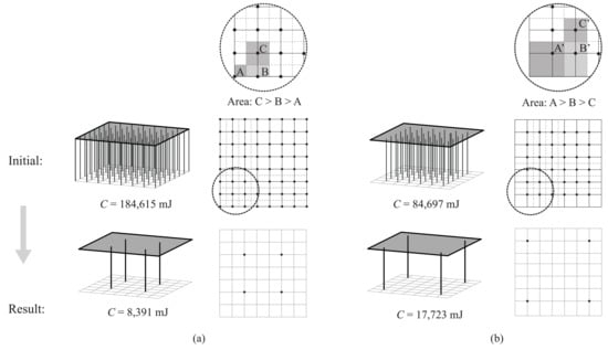 The first substrategy considers the loading area of candidate columns determined by their initial locations, where columns with a small and large loading area tend to be removed and preserved, respectively. This can be demonstrated more clearly using 8 × 8 and 6 × 6 candidate columns under the same roof with = 4, as shown in Figure 2a,b, respectively. Their final column distributions were different because of the variation of their initial loading areas around the roof edges. Corner candidate columns in Figure 2b correspond to a larger loading area, hence generating higher elastic-strain energy since early iterations during optimization tend to be preserved according to Equation (6). The compliance of Figure 2b was approximately twice larger than that of Figure 2a, suggesting that a local optimal solution was found. This paper considered all candidate columns under the roof, including columns on roof edges, to avoid local optimal solutions caused by edge columns in the following examples.