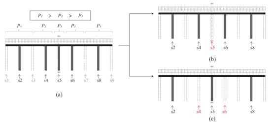 The third and final substrategy considers a filter in the optimization algorithm that can be used for producing a grid-independent solution and influencing optimization tendency [4]. This is illustrated using a 2D roof–column example in Figure 3. Figure 3a represents an intermediate state of an optimization process, with 5 columns being preserved from 9 candidate columns. The 5 remaining columns correspond to a different portion of a uniformly distributed load (), where are supported by Columns s2 and s8, are supported by Columns s4 and s6, and is supported by column s5. As mentioned in Section 3.1, columns with a smaller loading area tend to be removed first. Therefore, the optimization algorithm obtains the solution by removing Column s5, as shown in Figure 3b. A filtering technique was introduced for blurring and smoothing the loading information of columns, which enabled the columns located on the symmetric axis (s5) with a small loading area to be preserved without losing solution accuracy, as shown in Figure 3c.
