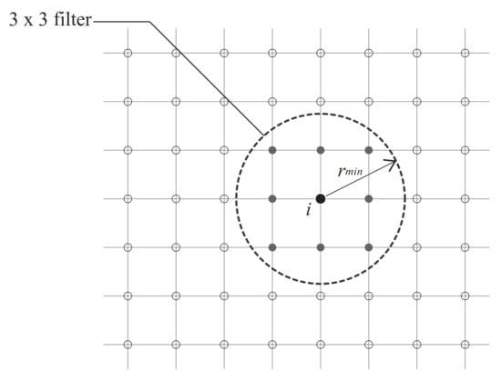 where is the linear weight factor, is the distance between column centers i and j, and is the filter radius, as shown in Figure 4. This paper only considered a 3 × 3 filter for the i-th column in the grid, which is the smallest filtering size, able to capture information of its 8 surrounding columns. The filter was only employed when a clear distribution of columns was obtained, as it is used for optimizing the locations of well-defined columns, as demonstrated in Figure 3. However, the definition of well-defined columns is mathematically vague in intermediate optimization states. The filtering condition was then set by introducing a parameter . This required the axial stress of columns to be ranked on the basis of their magnitude from high to low. The filter was employed if the summation of axial stress from the first of N columns exceeded 50% of total axial stress (), where . This paper utilizes the filtering technique in the following examples. The effect of different is explored in the next section.
