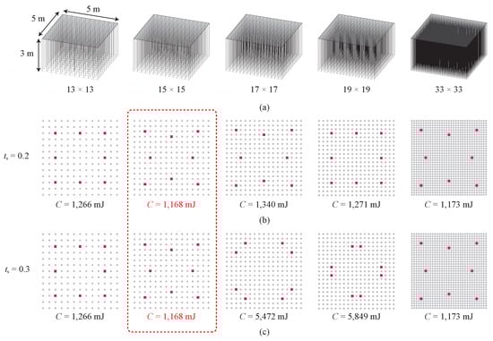 The entire optimization process was first tested using a simple 5 × 5 × 3 m design domain, which included a 100 mm thick square roof, and discrete candidate columns with a predetermined solid square cross-section of 100 × 100 mm, as shown in Figure 5a. The optimization solver searched for locations of = 8 columns under the square roof. Different candidate columns were tested, including a grid of 13 × 13, 15 × 15, 17 × 17, 19 × 19, and 33 × 33 columns. The filtering condition was tested for = 0.2 and 0.3, as shown in Figure 5b,c, respectively.