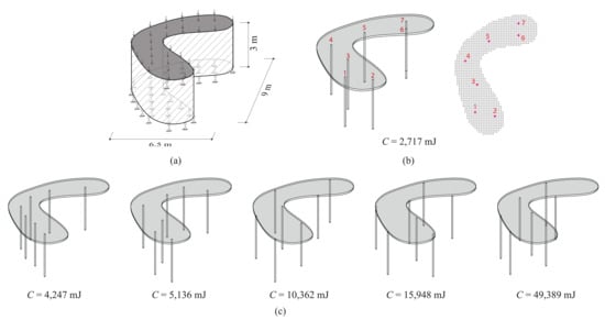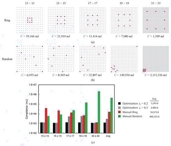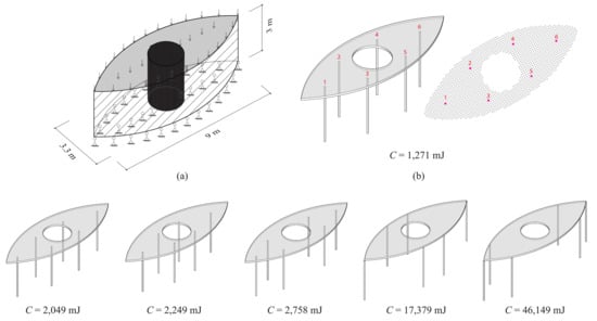 To demonstrate the efficiency of the proposed method, optimization results from Figure 5 are compared with manual results in Figure 6, which were generated from user-defined column locations arranged in “ring” and random configurations, as shown in Figure 6a,b, respectively. The ring-configuration selection was due to the shape similarity to the optimization results possessing small compliance in Figure 5. Small-to-large rings were tested, and the purpose of utilizing manual ring configurations was to systemically examine whether the optimization solver had obtained a near-global optimal solution, as highlighted in Figure 5. Furthermore, the utilization of random configurations demonstrated that there were many other potential combinations of column locations, representing a tedious trial-and-error process.