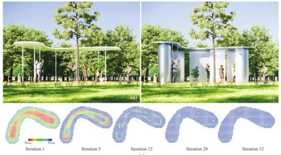 The integrated structural–architectural design was suggested to be an effective strategy for capturing complex requirements from both engineering and architectural perspectives [2]. This includes the utilization of structural optimization, where the optimization design process achieves specific objectives by changing defined design variables. For example, a curved frame’s minimal size and shape can be designed with a given applied load through optimization [3]. Many other applications were all enabled by extensive preceding work in structural optimization using diverse structural optimization methods [4], including continuum and discrete techniques.