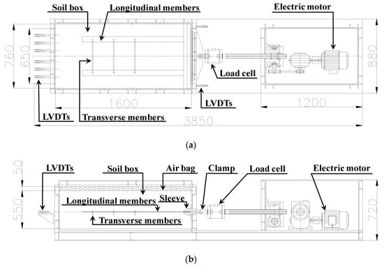 The large-scale pullout testing apparatus used in this study was manufactured by Iljin ENG (Incheon, South Korea), and it consisted of a rigid (soil) box, load (normal and pullout) device, and control box, as shown in Figure 1. The dimensions of the used rigid box (1600 mm length, 760 mm width, and 550 mm height) exceeded the recommended minimal dimensions given by ASTM (American Society for Testing and Materials) [27]. The rigid box can endure a pressure of 700 kPa. Normal stress could be applied up to 500 kPa by using an air bag, which provided a uniform surcharge load that was considered for the field condition. The pullout load was adopted for displacement control method using an electric motor that has control capacity for the displacement rate of 0.5–30 mm/min, and maximal pullout force was controlled up to 200 kN.
