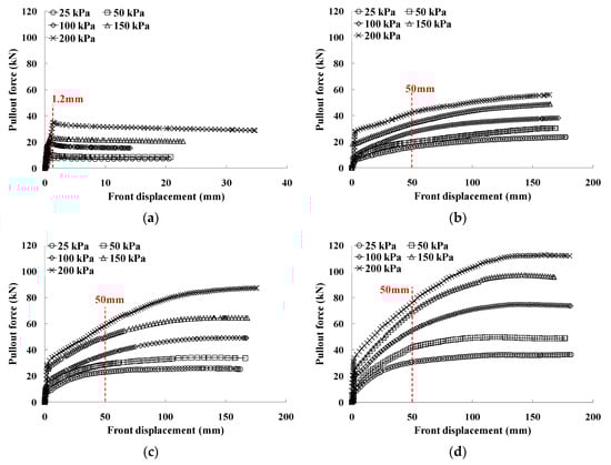 Figure 3 shows the pullout test results of both types of reinforcement. The pullout force of case SN showed a marked peak value regardless of normal stress conditions when the front displacement was within 1.2 mm; pullout force then gradually decreased (Figure 3a). The pullout forces of PS1-1, PS2-1, and PS3 rapidly increased when front displacement was within 4 mm, and they continuously increased according to the increment of the front displacement. A number of transverse members increased, and the increment ratio of pullout force increasingly grew (Figure 3b–d). However, there were no effects with stress less than 100 kPa when transverse members were more than 2. This means that pullout resistance initially (within 4 mm) appeared only as friction resistance due to longitudinal members. Therefore, bearing resistance due to transverse members has a significant effect when front displacement and normal stress are more than 4 mm and 100 kPa, respectively.