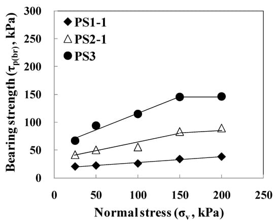 The pullout-resistance characteristic of inextensible reinforcement could be determined by the front displacement range as follows: (1) smooth strip, 1.2 mm, and (2) bar mats and welded wire meshes, 12–50 mm [30]. The pullout strength ( τ p ) of Types A (SN) and B (PS1-1, PS2-1, and PS3) could be calculated by using the determined displacement range. Figure 5 shows the calculated pullout strength and evaluated pullout parameters as listed in Table 3. The pullout strength of all cases had a linear increment as the increment of normal stress; the increment of normal stress and the transverse member caused greater increment. This means that the incremental effect of pullout resistance was due to the bearing resistance of transverse members. Friction strength ( τ p ( fr ) ) due to longitudinal members (SN) was subtracted from total pullout strength ( τ p ) in order to evaluate the bearing strength ( τ p ( br ) ) of transverse members in the cases of PS1-1, PS2-1, and PS3. Figure 6 shows the relationship between normal stress and bearing strength. The effect of bearing strength is increased in total pullout strength because of the increment of normal stress and transverse member. However, the incremental effect of bearing strength becomes almost constant if the normal stress is over a certain value, even though bearing strength increases as an increment of transverse members, because the bearing strength has not subsequently increased.