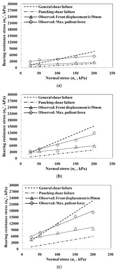 Bearing-resistance stress in all cases, which had applied pullout force at 50 mm front displacement, was close to the general shear failure in the lower normal stress condition. However, it was close to the punching shear failure if normal stress increased because there were considerable gaps between the pullout force at 50 mm front displacement and maximal pullout force, as seen in Section 4.1. Bearing-resistance stress closed from punching shear failure to general shear failure according to the increment of the transverse member due to the small interference effect between transverse members. The interference effect showed the same results according to the set installation location of transverse members as those for the pullout force of PS2-1, which was lower than that in the other cases (see Figure 4b). On the other hand, bearing-resistance stress applied with maximal pullout force was close to general shear failure regardless of the normal stress condition or number of transverse members, as the maximal pullout force appeared when soil mass was close to shear failure.