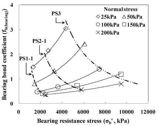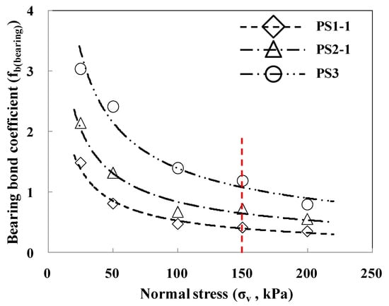 In the case of more than two transverse members, pullout resistance was affected by the distance between transverse members, as mentioned in Section 2.3. Figure 8 shows the relationship between bearing bond coefficient and normal stress for PS1-1, PS2-1, and PS3 considering the interference effect, which is calculated using Equation (12), and pullout force at 50 mm front displacement. The bearing bond coefficient was greatly reduced with a decrease in the number of transverse members in lower normal stress conditions. However, the reduction ratio of the bearing bond coefficient had little effect in any of the cases when the number of transverse members was decreased according to the increment of normal stress. This means that the interference effect was affected by the number of transverse members. The bearing bond coefficient was rapidly decreased within normal stress of 25–100 kPa in all cases. Subsequently, these became gradually constant, which was similar to the trend of bearing strength with a stress of over 150 kPa (Section 4.1). The reduction ratio of the bearing bond coefficient in PS3 was larger than that in the other cases because the interference effect was increased according to the increment of the transverse member, as mentioned above. This means that the increment of the interference effect was caused by the increase in the number of transverse members and normal stress.