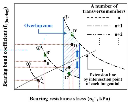 First, the calculated bearing-resistance stress and bearing bond coefficient, which have the same soil condition, can be plotted as shown in lines ①–③. Second, the intersectional point of each tangent line on the two sides, of which minimal and maximal normal stress is applied in lines ①–③, is extended and connected. The incremental ratio of bearing strength was decreased. Lastly, the prediction of a number of transverse members can be used to obtain the crossing point of the tangential line on the plotted line of bearing-resistance stress and bearing bond coefficient.