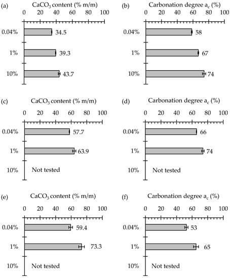 The thermal decomposition curves of all HVFA mortar samples did not show a distinct mass loss in the 400–500 °C temperature range. This indicates that there was no Ca(OH)2 present in those samples. Clearly, the remaining fraction of Ca(OH)2 that was not consumed in the pozzolanic hydration reaction of the fly ash, carbonated fully for all three exposure conditions under investigation (natural vs. slightly accelerated vs. highly accelerated carbonation). Contrarily, all these curves were characterized by a very pronounced continuous mass loss within the temperature range for CaCO3 in all its common mineralogical phases (550–680 °C: the amorphous phase; 680–780 °C: the metastable phase, i.e., vaterite and aragonite; 780–990 °C, the stable phase, i.e., well-crystallized calcite [32]). Figure 1a shows the CaCO3 content of the HVFA mortar (in % m/m relative to the binder) after 17 weeks of carbonation at 0.04%, 1% and 10% CO2. A most striking observation for these results was the significant increase in CaCO3 content with the applied CO2 concentration during carbonation. The corresponding carbonation degrees ac (%), that directly depend on this CaCO3 content, evolved in a very similar way (Figure 1b). The fact that samples carbonated at 10% and 1% CO2 reached the state of full carbonation already much longer than the naturally carbonated samples after 17 weeks, could perhaps have played a role. Nonetheless, TGA analysis performed on the samples subject to accelerated carbonation after already 4 weeks of exposure could not confirm this. CaCO3 contents and carbonation degrees for carbonation at 10% CO2 equaled 41.8% m/m and 71%. For the 1% CO2 exposure condition, these values amounted to 39.7% m/m and 67%. These values are very similar to what was recorded after 17 weeks of exposure. Carbonating the samples longer than needed to reach full carbonation (based on the colorimetric assessment method) can thus not be identified as a key influencing factor.
