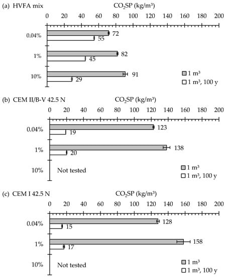 For a time and dimensions specific mortar volume, the effect of the applied CO2 concentration during carbonation testing changes. For the HVFA mix, CO2SP values decrease with the applied CO2 concentration. This mainly due to the important underestimation of natural carbonation rates when estimated from the outcome of accelerated carbonation experiments (see Section 3.1: 29–59%). The other two mortar mix designs still show a slight increase in CO2SP value when CO2 concentration during carbonation testing shifts from 0.04% to 1%. This can probably be explained by the fact that the underestimations of the actual natural carbonation rates when based on the outcome of an accelerated experiment conducted at 1% CO2 were limited (see Section 3.1: 6.0–7.5%). Under these conditions, the effect of having a higher carbonation degree with an increasing CO2 concentration applied, was more dominant.