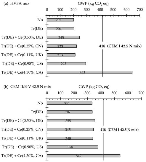 As a German fly ash was used for this research, it is evident that the Tr(DE) + Ce(DE) value is seen as reference case for the economic allocation approach (Ce: 0.50% cf. Table 3). It adds 43 kg CO2 eq and 20 kg CO2 eq to the carbon footprints of the binder fractions of the HVFA mortar and the CEM II/B-V 42.5 N mortar, respectively. It is logical that this increase is lower for the latter, given its lower fly ash content (23% as opposed to 50%). The GWP values drop further when the lower economic allocation coefficients representative for China (Ce: 0.25% cf. Table 3) and UK (Ce: 0.11% cf. Table 3) are considered. The opposite trend was observed in case of economic allocation based on data from the United States (Ce: 0.98% cf. Table 3) and Canada (Ce: 4.30% cf. Table 3). Economic allocation by 4.30% imposes overall carbon footprints for both fly ash-based mortars (HVFA: 643 kg CO2 eq; CEM II/B-V 42.5 N: 542 kg CO2 eq) that exceed the Portland cement-based reference mortar (CEM I 42.5 N: 418 kg CO2 eq.) by far. For this calculation approach, it seems no longer sustainable to incorporate fly ash in the binder system, even when the amounts remain limited to the typical Portland clinker replacement levels of commercial composite cements.