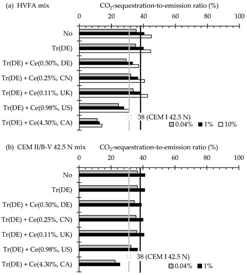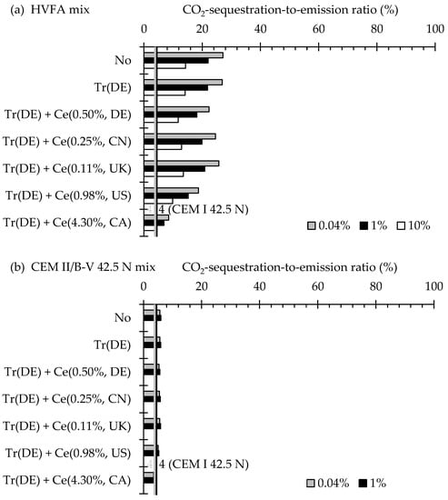CO2-sequestration-to-emission ratios for the binder fraction of a 100-year timeframe, dimensions specific 2.24 × 2.24 × 0.20 m3 = 1 m3 of the HVFA mortar (a) and CEM II/B-V 42.5 N mix (b) in relation to the one of reference CEM I 42.5 N mortar, using various approaches for assigning impact for their fly ash content: No impact (No), impact of basic treatment (Tr(DE)), impact of basic treatment and economic allocation (Tr + Ce).