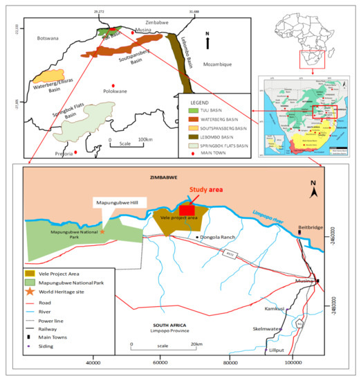 - Brandl, G. The Geology of the Messina Area. Explanation Sheet Geological Survey South Africa, 2230 (Messina); Council for Geoscience: Pretoria, South Africa, 1981; pp. 1–35. [Google Scholar]