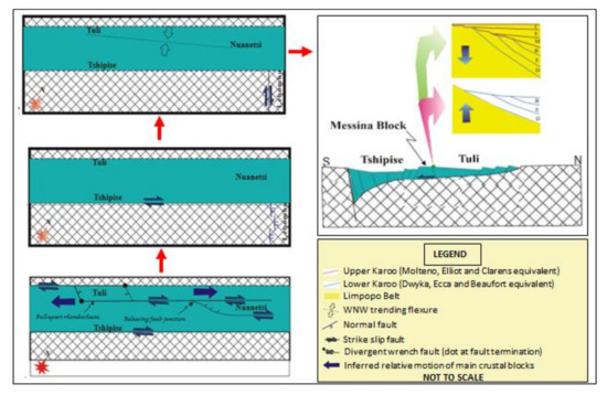 Tectonic evolution model of Limpopo Karoo Basins and the Lebombo Monocline (after [1]). Note: red stars in Figure 2 show the cardinal direction (north is shown as N).