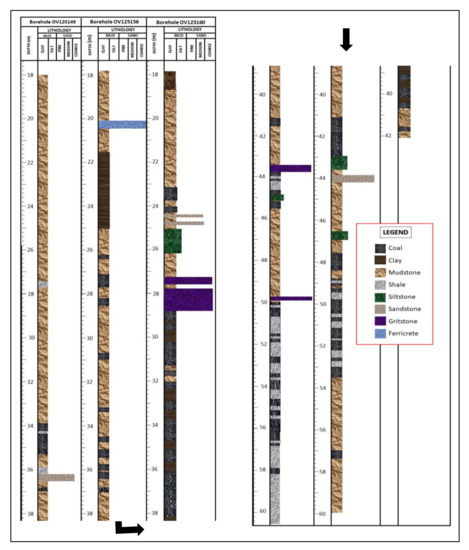 The stratigraphic sequence of the Madzaringwe Formation in the Vele colliery consists mostly of mudstone and carbonaceous shale with thin layers of coal seams, siltstone and sandstones. The Madzaringwe Formation has a thickness of about 61 m, 60 m, and 42 m in boreholes OV125149, OV125156, and OV125160, respectively (Figure 4).