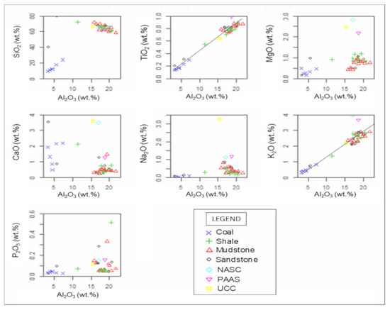 Bivariate plot of major oxides against Al2O3 showing the distribution of shale and coal samples from the Madzaringwe Formation. Average data of UCC, NASC, and PAAS extracted from [5,25,26], respectively are plotted for comparison.