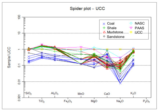 Relative to the Upper Continental Crust (UCC) and Post Archean Australian Shale (PAAS), the concentrations of major elements in the studied samples are generally similar, except for MnO and Na2O, which consistently yields much lower average relative concentration values than those of UCC and PAAS (Figure 7 and Figure 8). The depletion of Na2O (<1%) in the Madzaringwe mudrocks and sandstones can be attributed to a relatively smaller amount of Na-rich plagioclase in them, which is consistent with the petrographic observation and XRD data. The ratio of K2O/Na2O also shows that K-feldspars dominate over plagioclase (albite) feldspar. The contents of K2O and Na2O and their ratios (K2O/Na2O > 1) are also consistent with the petrographic interpretations. Compared with the North American Shale Composite (NASC), UCC, and PAAS, the shales are low in MgO, CaO, and Na2O. On the average, the shales have a similar concentration of SiO2 with that of NASC.