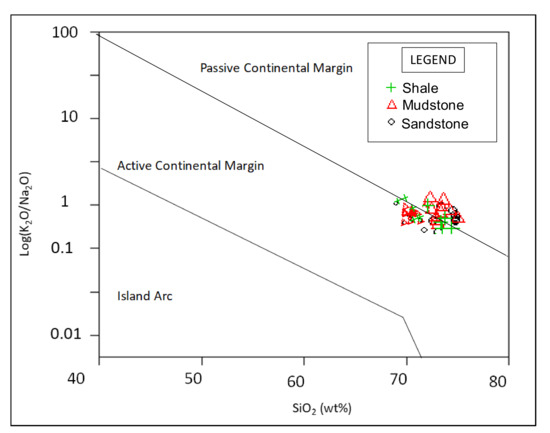 Several researchers including [6,9,27,28,29] have envisaged that tectonic settings control or influence the chemical compositions of clastic sedimentary rocks, indicating that variety of tectonic settings have terrain-specific signatures. Different tectonic setting discrimination diagrams have been used to separate between different tectonic settings, and they all provide consistent results for siliciclastic rocks that have not been strongly affected by post-depositional weathering and metamorphism [6,27,28]. Similarly, the bivariate and ternary plots of major and trace element geochemistry have been widely used by several researchers to determine the tectonic setting of shales [14]. The most used discrimination diagrams are major element-based discrimination diagrams of [27,28]. The geochemical data of the studied samples were plotted on binary plots of SiO2 against Log (K2O/Na2O), TiO2 versus (Fe2O3 + MgO), and ternary plot of Th–Sc–Zr/10. The binary plots of SiO2 against K2O/Na2O and TiO2 versus (Fe2O3 + MgO) show that the sedimentation of the studied samples were related to both active continental and passive continental settings (Figure 9 and Figure 10). Likewise, the ternary plot of Th–Sc–Zr/10 revealed that the samples were mainly deposited in a passive continental setting, with little contribution from active continental margin setting (Figure 11).