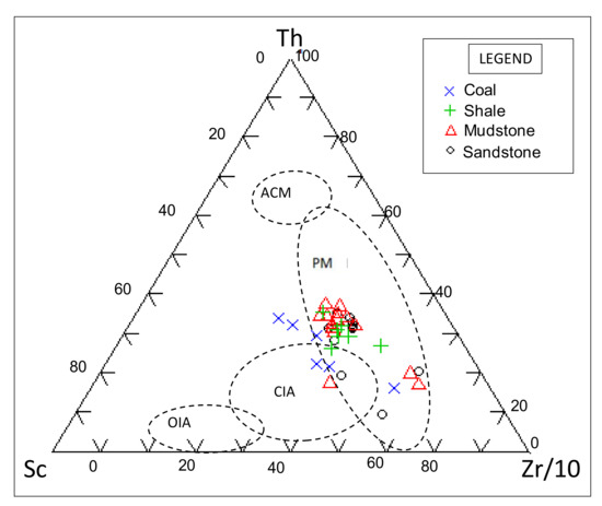 Geochemical compositions of the coal, mudrocks and sandstones were analysed to identify provenance, paleoweathering conditions and tectonic setting of the Madzaringwe Formation. The geochemical data of major and trace elements show that the studied rocks have the same source. Based on the discriminant function plots, it can be inferred that the rocks are of quartzose sedimentary provenance, suggesting that they were derived from a cratonic interior or recycled orogen. The binary diagram of the TiO2 versus Zr and La/Sr against Th/Co as well as the discriminant function plots revealed that the mudrocks and sandstones are mostly of silicic or felsic igneous provenance. These source areas might have been from adjacent areas which include the Limpopo Belt (igneous and sedimentary rocks), and basement uplifted rocks of the Beit-Bridge Complex, consisting of the granite, granite-gneisses and schists near Tuli coalfield. The binary plots of TiO2 versus (Fe2O3 MgO) and SiO2 against K2O/Na2O, and ternary plots of Na2O–CaO–K2O and Th–Sc–Zr/10 revealed that the studied samples are of passive-active continental margin settings. The A–CN–K ternary diagram and indices of weathering revealed that the source rocks underwent a moderate to high degree of chemical weathering. Also, the indices of weathering/alteration and the binary plot of the index of compositional variability (ICV) against the chemical index of alteration shows that the studied samples are geochemically matured and have been subjected to moderate to intensive weathering.