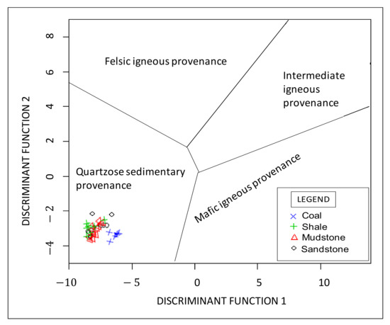 Major element Discriminant Function diagram for sedimentary provenance (shale, and coal samples (Background field after [30]). The discriminant functions are: Discriminant Function 1 = (−1.773 TiO2) + (0.607 Al2O3) + (0.760 Fe2O3) + (−1.500 MgO) + (0.616 CaO) + (0.509 Na2O) + (−1.224 K2O) +(−9.090); Discriminant Function 2 = (0.445 TiO2) + (0.070 Al2O3) + (−0.250 Fe2O3) + (−1.142 MgO) + (0.438 CaO) + (1.475 Na2O) + (−1.426 K2O) + (6.861).