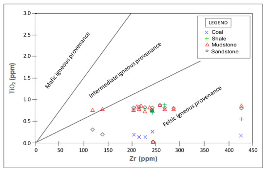 Using major oxides as variables, Roser and Korsch [30] established major element discriminant functions to differentiate four major provenance fields, namely mafic, intermediate, felsic and quartzose recycled. Likewise, the binary plots of TiO2 vs Zr, and La/Sr vs Th/Co have been successfully used to infer provenance of clastic sedimentary rocks [5,6,7,14,31]. The bivariate plot of discriminant 1 against discriminant 2 on the background diagram of [30] shows that the samples are of quartzose sedimentary provenance (Figure 12). This deduction is in agreement with a probable deposition in the realm of a passive margin (as highlighted in the previous section), with a significant influence of the sedimentary processes (transport from source areas far away from the sedimentary basins) over the mineralogical and geochemical features observed in these rocks, resulting in mature sedimentary rocks with an enrichment of the quartzose fraction. The binary diagrams of the TiO2 versus Zr (Figure 13) and La/Sr against Th/Co (Figure 14) show that the studied rocks are from silicic or felsic igneous rocks. The XRF result also shows the enrichment in Sr and Ba and depletion of transitional elements like Cr, Co, Ni and V, suggesting the trivial or minor influence of mafic provenance as indicated by [32]. The high ratio of Ba to Co (Ba/Co) (Supplementary data; Supplementary Materials Data; Table S2) perhaps point to the fact that the sediments were derived from weathered felsic-granitic sources [33]. In general, the findings of this study agree with the work of [10,16,19] in that the Madzaringwe Formation is of quartzose sedimentary provenance derived from felsic igneous rocks.