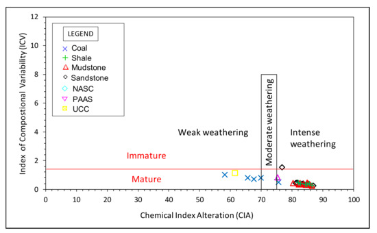 The calculated values for the chemical index alteration (CIA), chemical index weathering (CIW) and plagioclase index weathering (PIA) are presented in the supplementary data (Supplementary Materials Data; Table S5). The CIA is in a simplified way the ratio of primary minerals to secondary products (i.e., clay minerals). CIA values, usually ranging from about 50 for unweathered rocks up to 100 in highly weathered rocks. The CIA values for the studied samples range from 45.64% to 87.00%, suggesting weak to intense weathering conditions. Also, the binary plot of CIA against ICV shows that the samples are matured and have undergone weak to intense weathering conditions, mostly intense weathering (Figure 15).