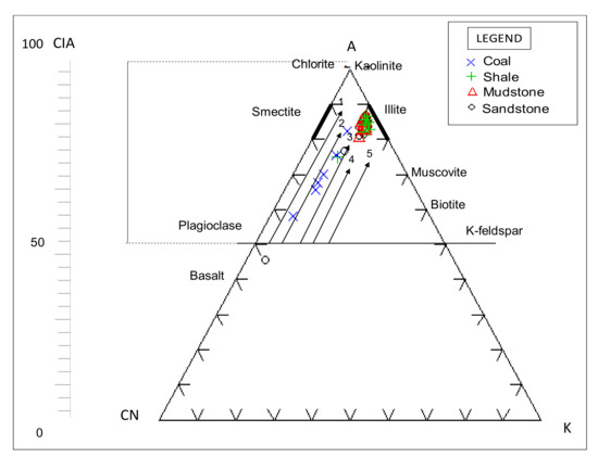 In addition, the weathering of feldspars to clay minerals can be monitored using the plagioclase index of alteration (PIA) [38,39]. The PIA values of the studied samples range from 45.16% to 96.81% (averaging 88.58%). The PIA values indicate moderate to intense destruction of feldspars during transportation, sedimentation and diagenesis. The ternary plot of A–CN–K proposed by [3] is another way of evaluating the composition of the source rock as well as the mobility of elements during the process of chemical weathering of source materials and post-depositional chemical modification. The ternary plot of Al2O3–(CaO + Na2O)–K2O (exemplified as A–CN–K) shows that the studied samples plotted above the line joining plagioclase and K-feldspar (Figure 16). The weathering trendline of the samples tends towards the A–K boundary, suggesting the silicates (i.e., feldspar) have experienced moderate to high weathering, perhaps causing the leaching of calcium (Ca) and sodium (Na) out of plagioclase [38]. Furthermore, the trendline (arrows in Figure 16) parallels with the A–CN boundary and slightly extend towards the illite, signifying leaching of potassium (K) and enrichment of aluminium (Al) resulting in the decomposition of K-bearing minerals (biotite, kaolinite, and potassium feldspar). Thus, illite dominates the secondary clay minerals. On the other hand, the weathering trendline of the samples is relatively closer to the A–CN boundary, indicating that plagioclase is the first to be weathered, out of which Ca and Na leached rapidly, whereas K-feldspar is relatively stable. In the sandstones, illite is the main weathering product [38].