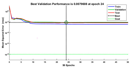 Figure 4 shows the error in signal modeling using the AR technique, the ARXU method, and the proposed AMRXU algorithm for resampled RMS signals in a normal state. In Figure 4, the accuracy of the normal resampled RMS signal modeled using AR is around 51.33%; by ARXU, it is around 85.5%, and based on AMRXU, the accuracy is 98.5%. Thus, the linear AR and ARXU approaches are not accurate enough to model the nonlinear and nonstationary signals. To address this issue, the nonlinear signal modeling approach using proposed AMRXU is suggested in this work. The mean square error (MSE) of the RMS resampled normal signal modeling using the AMRXU for training, validation, and testing is presented in Figure 5. From the figure, we can observe that MSE curves sharply decrease within the first 7 epochs until they reach the MSE level of near 0.01. Then, for the next 17 epochs, some oscillations can be approximated, and these curves converge to an MSE level of around 0.0079.