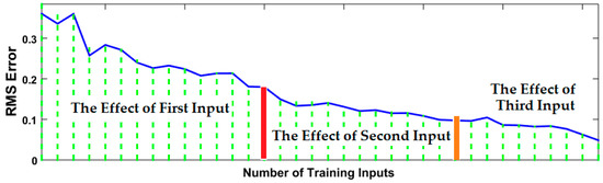 The AMRXU-PMI and AMRXU-VSPMI methods are inherently linear estimators and the most significant advantage for them is that we can perform model structure and parameter identification rapidly. The performance of signal pattern recognition in these techniques appears to be satisfactory. However, to increase the performance of fault diagnosis, pattern identification and crack size detection, the AMRXU-AVSPMI is suggested in the paper. Figure 6 shows the effect of the SNFS technique and training the inputs on the RMS error of signal estimation. In this case, the SNFS algorithm has 34 nodes, 32 linear parameters, 18 nonlinear parameters, and eight fuzzy rules. The elapsed time in this SNFS design is 0.223 s. To have the minimum RMS error, the first, second, and third inputs need to have 15-, 12-, and 9-times training, respectively.