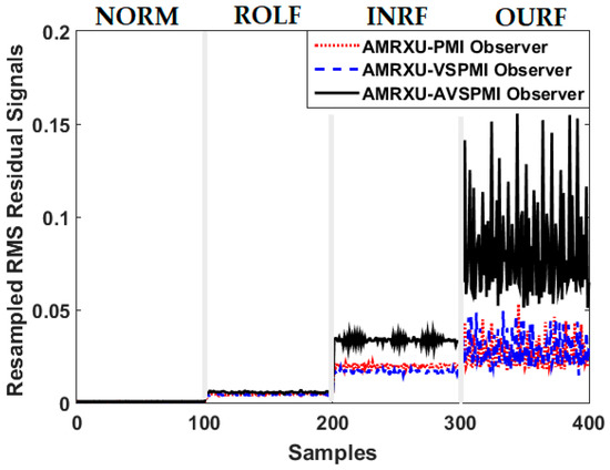 Resampled RMS residual signals under normal and abnormal conditions using AMRXU-PMI, AMRXU-VSPMI, and the proposed AMRXU-AVSPMI observers.