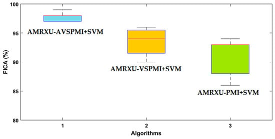 The boxplots of the FICA metric over 10 experiments for the AMRXU-AVSPMI+SVM, AMRXU-VSPMI+SVM, and AMRXU-PMI+SVM.