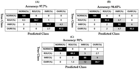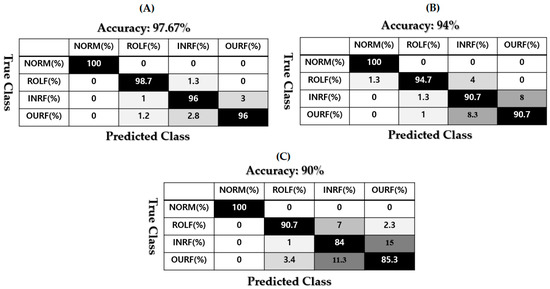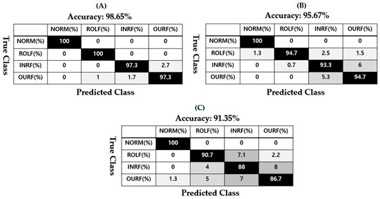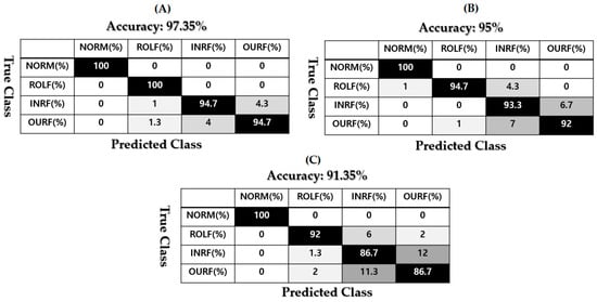 The average fault identification accuracy based on (A) the proposed AMRXU-AVSPMI+SVM, (B) AMRXU-VSPMI+SVM, and (C) AMRXU-PMI+SVM (torque load: 3 hp).