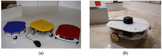 - eMIR mobile robot of differential structure—is a mobile educational robot designed and built at the Faculty of Mechanical Engineering and Naval Architecture in Zagreb. It is equipped with an independent power supply, communication modules, camera module, range sensors and software interface. The eMIR is shown in Figure 1a. For this research, an additional mobile robot eMiR (white) has been made.