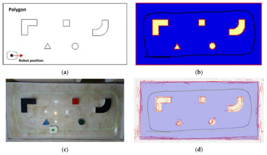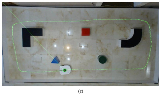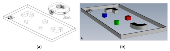 The main goal of the research presented in this paper is experimental checks, corrections, and adjustments of the used autonomous mobile robot’s behavior on the real polygon. Additionally, adjusting the real robot system’s behavior to match the virtual simulation robot’s model behavior is needed [30]. All the robot’s environment recognition and control algorithms were tested in the virtual reality software tool CoppeliaSim [31]. A virtual dynamic model of an eMIR (educational Mobile Intelligent Robot) mobile robot shown in Figure 4b and corresponding polygon configuration shown in Figure 5, are designed. Software support for constructing an experimental system is written in C++ programing language. By giving parameters and harmonizing these experiment outcomes, patterns and guidelines are provided for research, development and testing of algorithms for an autonomous cognitive behavior of mobile robot models in environments that do not have to be highly defined, for a much more comprehensive range of users, all with the aim of more effortless knowledge transfer [32].