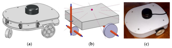 Development of mobile robot educational Mobile Intelligent Robot (eMIR): (a) 3D Computer Aided Desing (CAD) model of eMIR; (b) dynamic model of eMIR (CoppeliaSim virtual reality simulator); (c) real mobile robot eMIR.