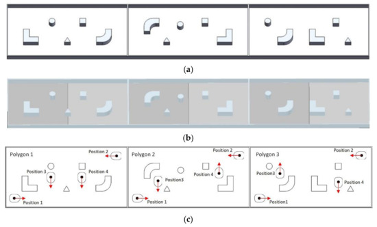Various polygon configurations: (a) 3D Computer Aided Design (CAD) models of three different polygon configurations for robot cognitive behavior training (b) models of three various polygon configurations constructed in CoppeliaSim, virtual reality software; (c) three various polygon configurations with four eMIR mobile robot starting positions that represent phases of learning, simulation and real experiment motion path.