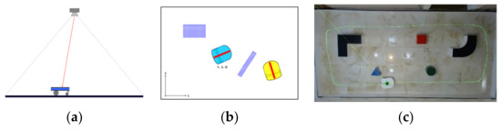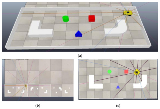 Figure 6. CoppeliaSim virtual reality polygons: (a) 3D side view of random polygon configurations with a mobile robot in motion; (b) stack of three various polygons made for mobile robot’s learning and training; (c) virtual reality polygon model with laser range sensor beams for detection of obstacles on every 36° pattern, identically configured as real polygon configuration shown in Figure 3a. - CoppeliaSim simulator (V-Rep)—is a virtual reality software with the possibility of many various robotic mechanism simulations that include dynamic properties. It has an integrated development environment, based on a distributed control architecture: each object/model can be individually controlled using a built-in script or custom software solution. It makes the simulator practised very versatile and ideal for multi-robotic applications. A robot’s and mechanism’s controllers can be written in several programing languages, such as C/C++, Python, Java, Lua, MatLab or Octave. It can be used as a standalone application or can be easily embedded in a user’s main application, as it has been done in this research. It has been used as a virtual simulation software platform in learning and testing process. Direct import of various 3D CAD models of polygons from any CAD software tool considerably advances model and configuration equivalence in the learning, testing and experimental validation on the real-world polygons. Augmented reality (AR), which is also used in this research, is also useful in making realistic models and experiment plans more intuitive.