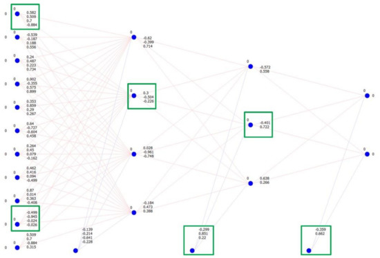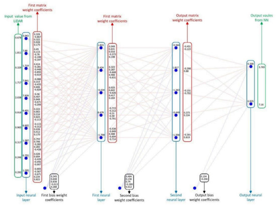A detailed description of the neural network parts, i.e., the layers and weight coefficients is given in Figure 8. The neural network’s input neural contains ten values representing the detected distance from the LiDAR sensor (numerical values in the green frame). The same layer contains marked neural points (blue points in blue frame) where is the input activation function executed.