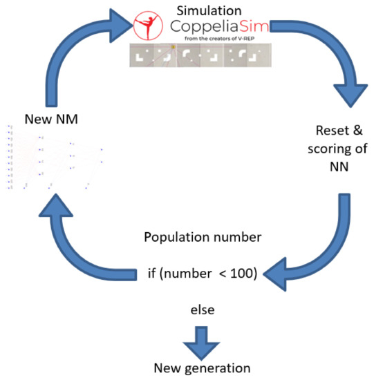 The first condition for simulation stop is a collision detection between eMIR and obstacles placed in the polygon. A second condition is reached iterations limit (specifically 1000 iterations). The last condition is when eMIR reaches maximum path distance. After stopping the robot’s movement, eMIR’s home position is initialized. The control neural network is evaluated, i.e., scored, by summing several parameters with an assigned specific coefficient (particular influence of individual scores on the total score): (a) exploration score of an environment; (b) wheels velocities; (c) difference in left and right wheel velocity; (d) simulation loops number; (e) eMIR’s distance reached; (f) an angle between the eMIR and free environment. The net score of particular neural network is calculated using formula: